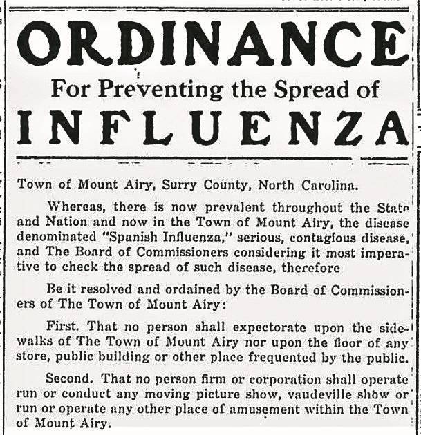 https://www.mtairynews.com/wp-content/uploads/2020/03/web1_ORDINANCE.jpgOn Oct. 17, 1918, the Mount Airy Board of Commissioners passed ordinances forbidding spitting on the sidewalk or in stores or other public places, theaters or “other place(s) of amusement” to operate, crowds to congregate anywhere from stores to schools to churches. Drinks must only be served in bottles unless served in single-use paper cups. “Congregating in barber shops and the depot” was unlawful except for business. Violators incurred a $50 fine. Mount Airy Museum of Regional History