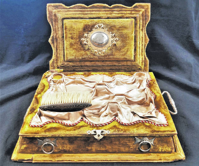 SWANNANOAH HADLEY box – Swannanoah Brower Hadley seems to have been named for the North Carolina town and river of the same name. It is an Anglicized form of the Cherokee name for the trail that lead to the Cheraw tribe who lived to the east. Based on records made by Hernando de Soto’s expedition in 1540, the Cherow apparently called themselves something close to “Suwala.” The Cherokee called the trail to the Suwala/Cherow Suwa’li-nunnohi, ‘Suwali path,’ which, on the English tongue became Swannanoah. This velvet-covered Princess Pat toiletry box belonged to Swann who died in 1973 at 109 years old.